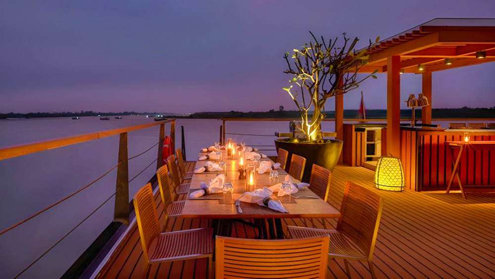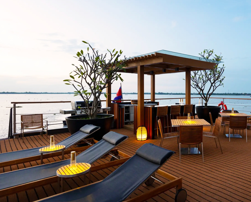Evening arrives softly, marked by cocktails on deck and a refined dinner enjoyed as the Mekong darkens and the rhythm of the river settles in.