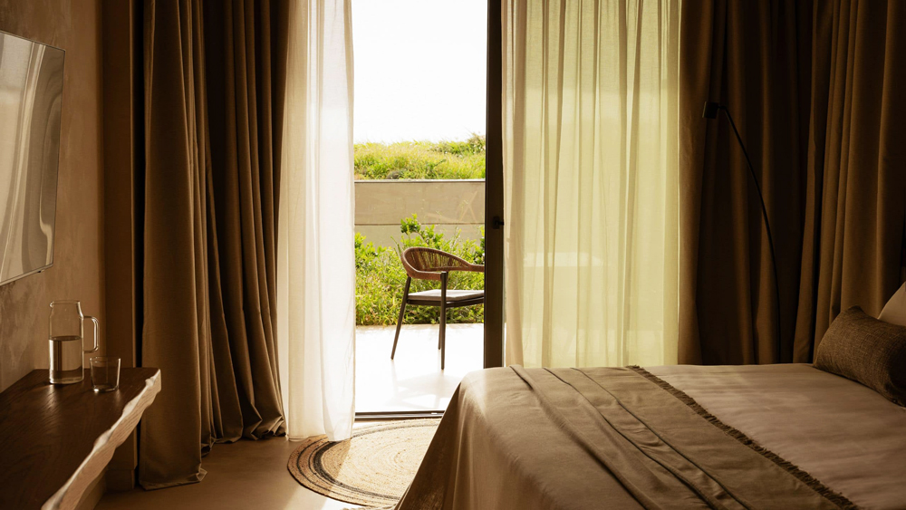 The rooms at Zélia Halkidiki are calm, light-filled spaces designed for restorative comfort. Soft neutral palettes, natural materials, and clean-lined furnishings create an atmosphere that feels contemporary yet grounded. Floor-to-ceiling windows draw in the surrounding landscape, while private balconies or terraces extend the living space outdoors—ideal for slow mornings and golden-hour stillness.