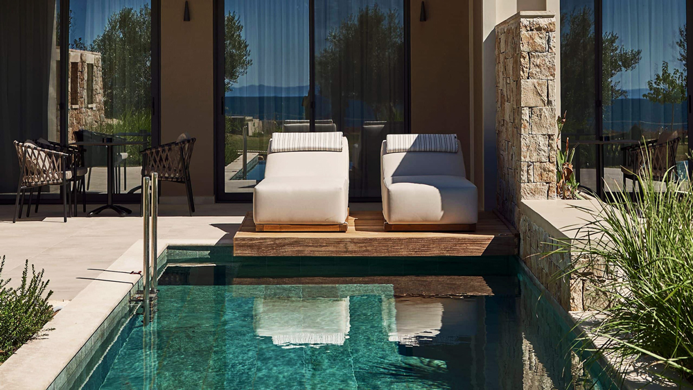 Suites introduce a greater sense of space and privacy, with separate living areas and expansive terraces that emphasize the resort’s elevated views. Whether overlooking the Aegean or the surrounding hills, the suites feel quietly indulgent, suited to longer stays or travelers who value room to truly settle in. The aesthetic remains restrained and cohesive, allowing light, air, and landscape to lead.