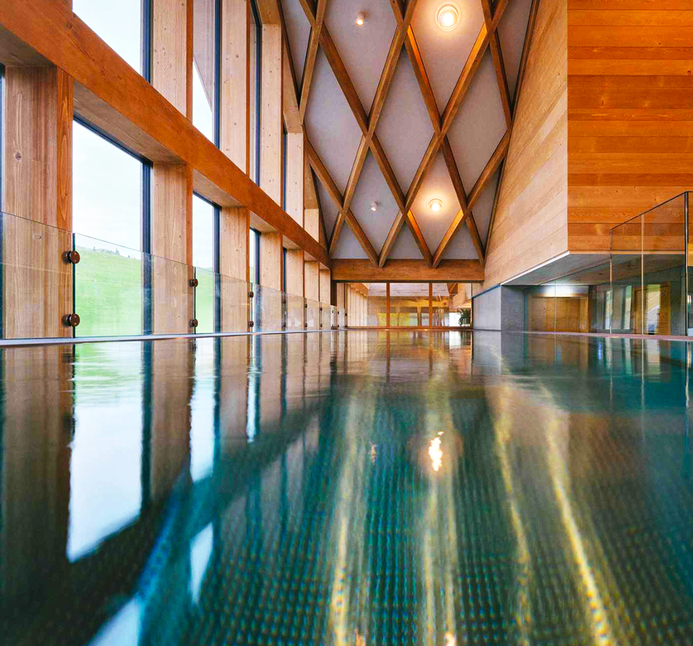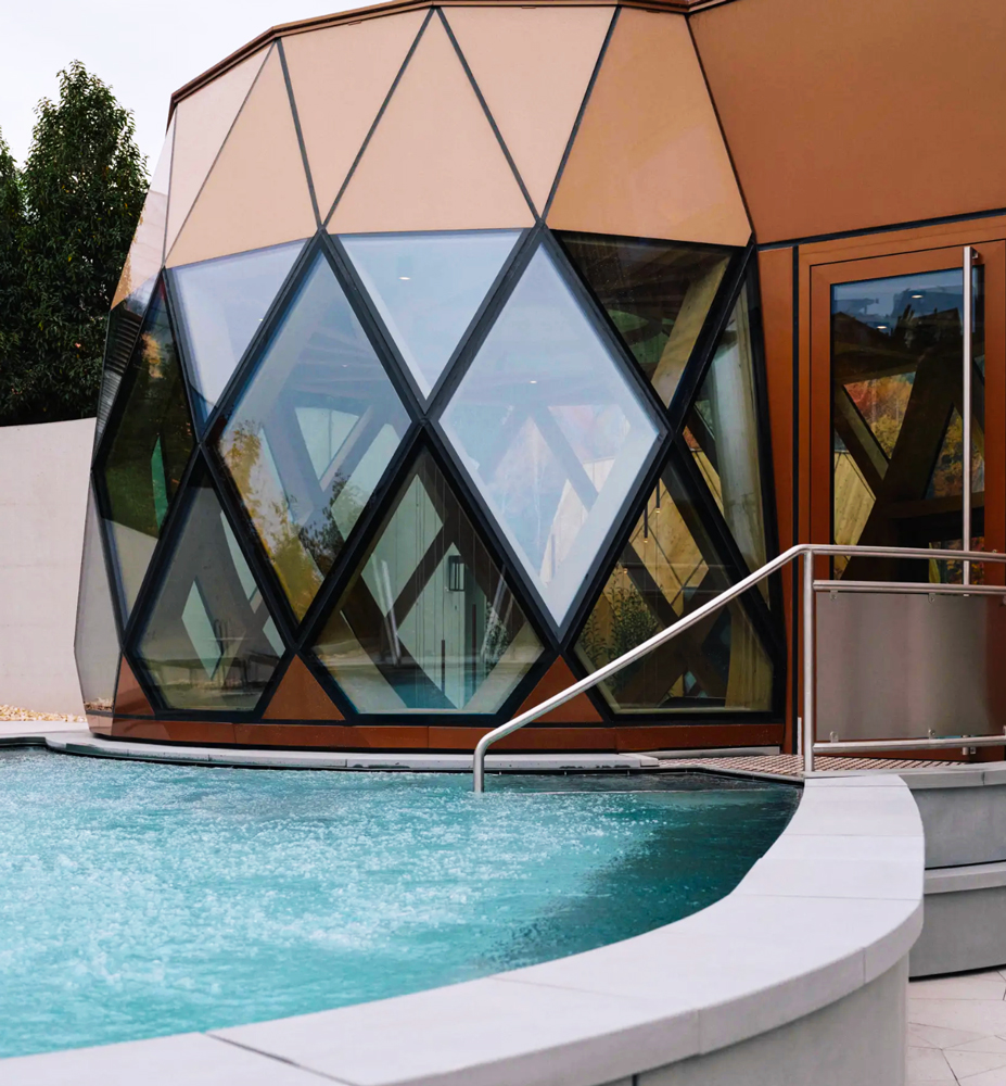 Eight sauna and steam environments shape the thermal ritual. From dry heat chambers to aromatic steam rooms, the experience follows the classic European cadence of warm, cool, rest — repeated slowly, intentionally. Spacious relaxation lounges complete the cycle, inviting guests to linger rather than rush. Materials remain natural and restrained: pale timber, textured stone, panoramic glass. The mountains are never visually distant.