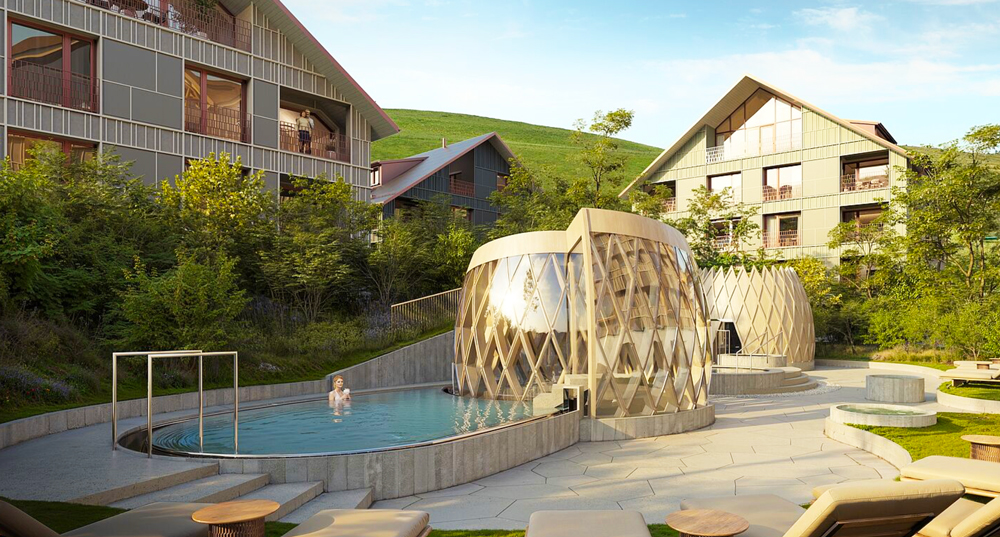 In the pastoral landscape of Appenzell, where green hills rise gently toward the Alpstein mountains, The QUELL SPA at Huus Quell by Appenzeller Huus defines a new chapter in Swiss alpine wellness. Spanning approximately 2,200 square meters, the spa is not an amenity — it is the architectural and emotional center of the hotel.