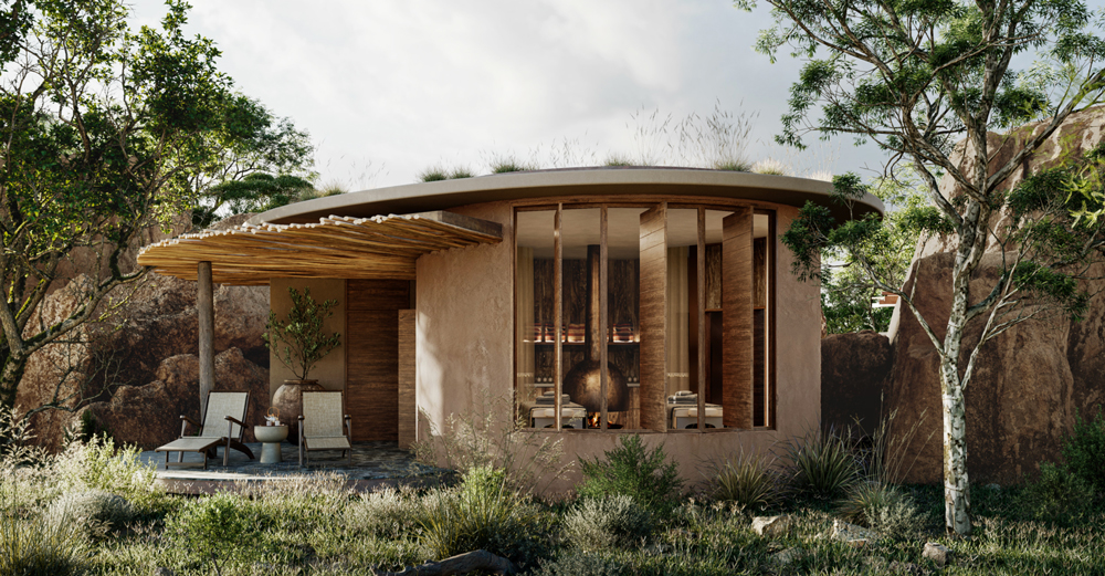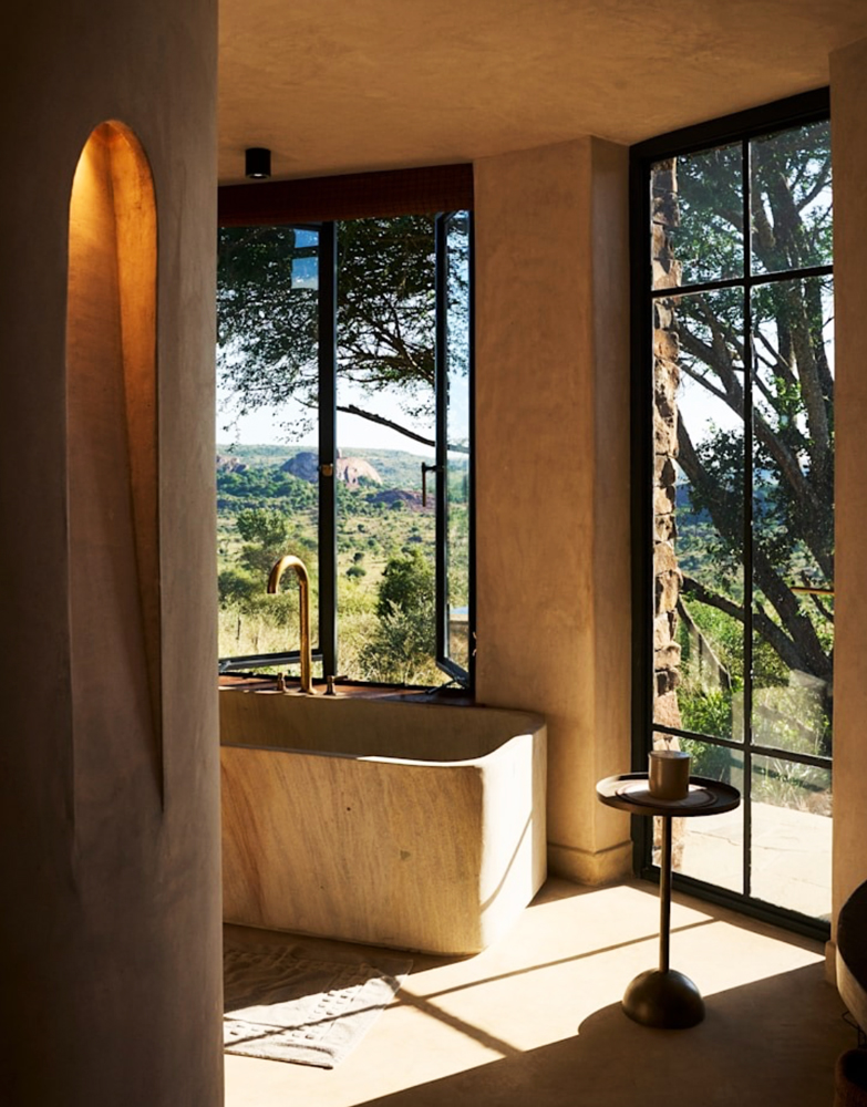 The design reflects what architects describe as an “Afro-Wabi-Sabi” aesthetic, combining hand-crafted materials with natural textures that mirror the colors of the surrounding landscape. Stone, wood, and lime plaster create a calm, earthy palette that feels grounded in the environment.
